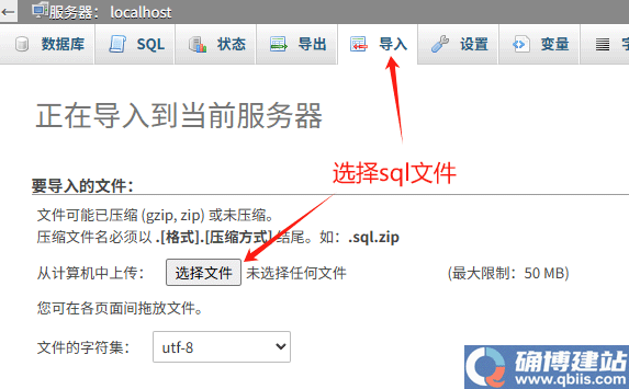 选择SQL点击导入,导入前一定要先选择刚创建的数据库